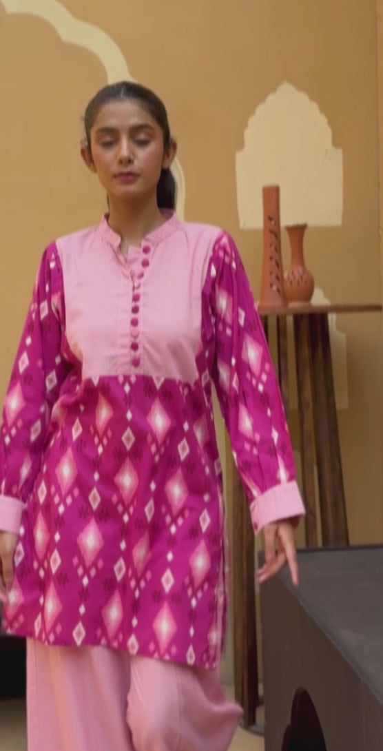 | Pink Print with Solid Patch! With its intricate print details and button detailing, you'll be the center of attention wherever you go. This long dress is not only stylish but also perfect for any occasion. Dive into fashion with this must-have piece! |