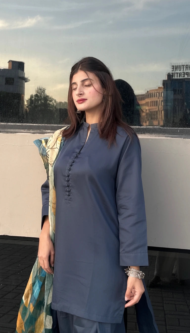 This outfit boasts whimsical soft satin cotton weave, complete with customized fabric wrapped round buttons that add a charming touch to the neckline. Paired with our iconic Farshi Slawar , it takes the entire look to new heights.