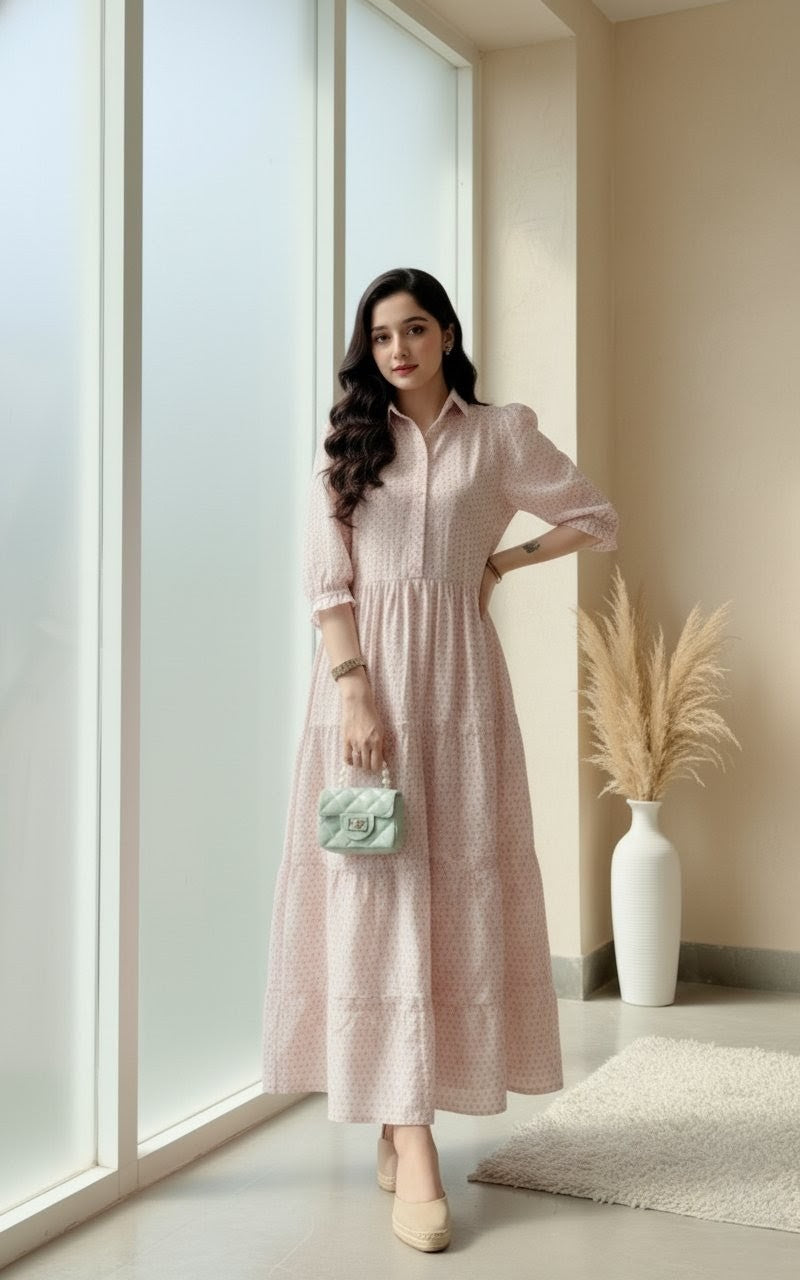 Upgrade your wardrobe with this elegant light pink cotton 1-piece maxi dress designed for effortless style and comfort. Made with breathable cotton fabric, this dress features a soft print pattern, three-quarter sleeves, and a relaxed fit – perfect for casual outings, daily wear, or summer gatherings.